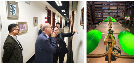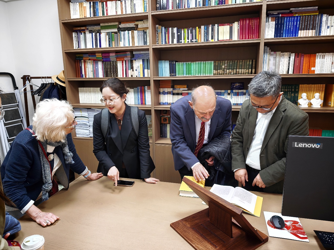 当日下午,布拉塞利斯院士一行在熊林处长和史冰川主任的陪同下,实地参观了哲学系公共文化空间、专业图书馆及古希腊语汉语大辞典编撰与研究工作室。参观过程中,史冰川主任向来宾详细介绍了哲学系的历史沿革、学科建设、师资力量及近年来在学术研究领域取得的突出成果。