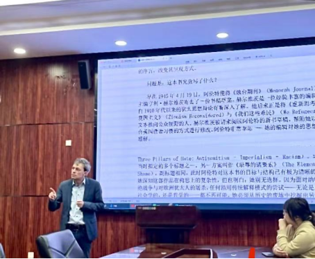 讲座伊始,迈耶教授开宗明义地指出,理解汉娜·阿伦特思想的关键在于把握其“生命与思想的统一性”。他强调,阿伦特并非传统意义上的哲学家或政治理论家,而是一位将个人生命经验与时代剧变深刻融合的思想者。她的思想道路无法以学科体系归类,必须通过“传记性方法”加以理解——即在其生命历程与思想发展的交织中,探寻她对二十世纪政治灾难与人类境况的深刻回应。迈耶教授系统梳理了阿伦特思想发展的几个关键阶段:从早期关于奥古斯丁“爱的概念”的博士论文,到流亡期间对犹太问题的历史-社会学分析;从与卡尔·曼海姆的思想对话,到其政治哲学代表作的成书过程。迈耶教授指出,阿伦特之所以不愿被简单归类为哲学家,是因为她认为传统哲学与现实的重大变革之间脱节,难以回应现代性危机。为此,她构筑了一种融合历史、社会学与哲学视野的跨学科理论,以直面“时代断裂”带来的根本挑战。在分析其代表作时,迈耶教授着重阐释了阿伦特对20世纪西方极端政治现象的系统性批判,揭示其如何侵蚀人的基本价值。